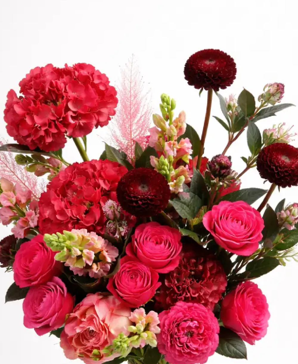 A bold luxury floral arrangement featuring rich crimson hydrangeas, deep burgundy blooms, and vibrant pink roses, styled in a premium gold-finish vase. A statement piece designed for dramatic, elegant interiors by FloriaLuxe.