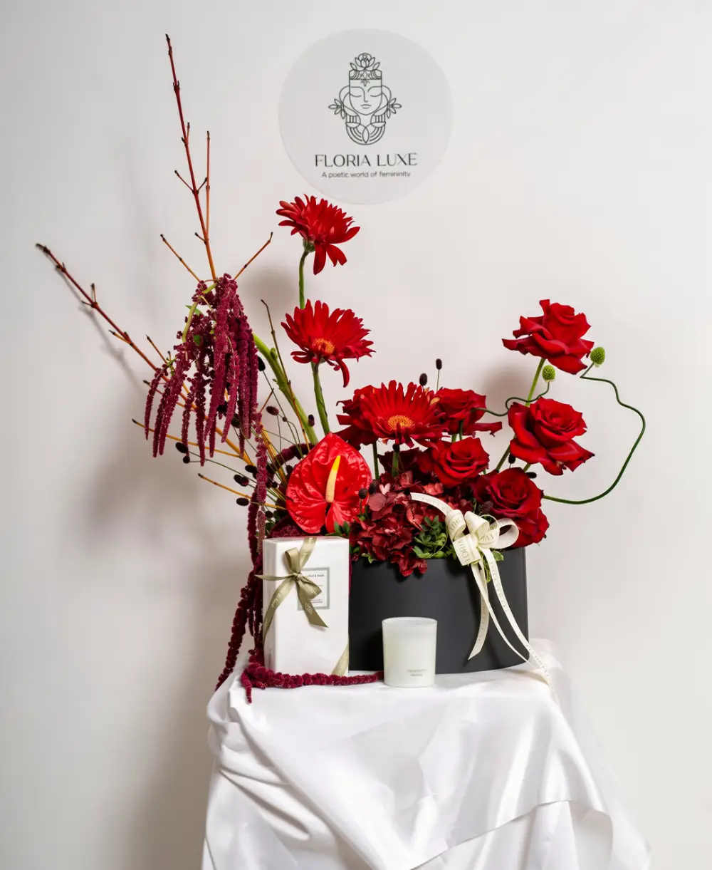 Make a lasting impression with this Luxury Red Bloom Designer Flower Arrangement, thoughtfully handcrafted for those who appreciate elegance with a modern artistic touch. Featuring a stunning mix of premium red roses, gerbera-style blooms, exotic foliage, and textured elements, this arrangement blends romance with contemporary floral design.